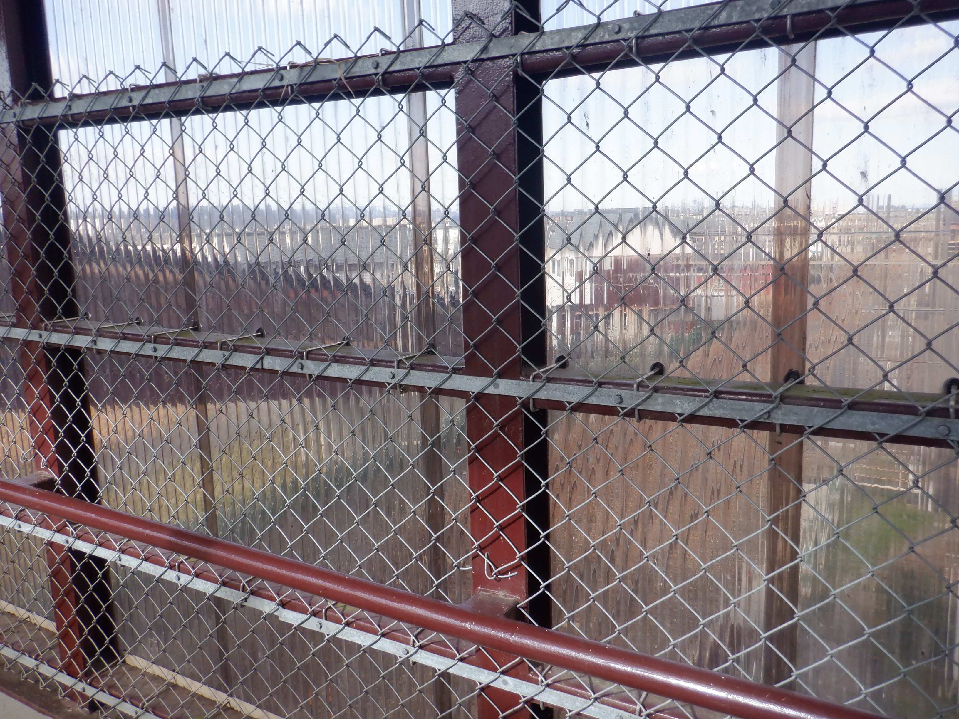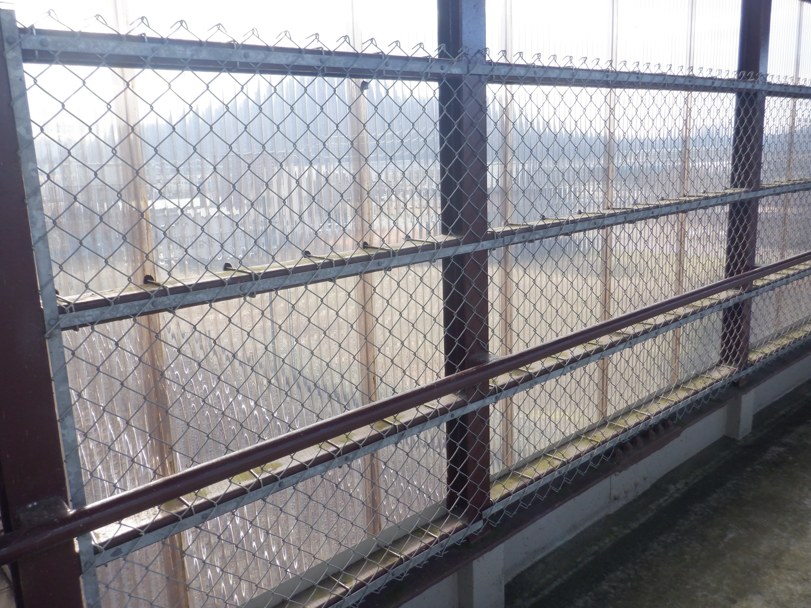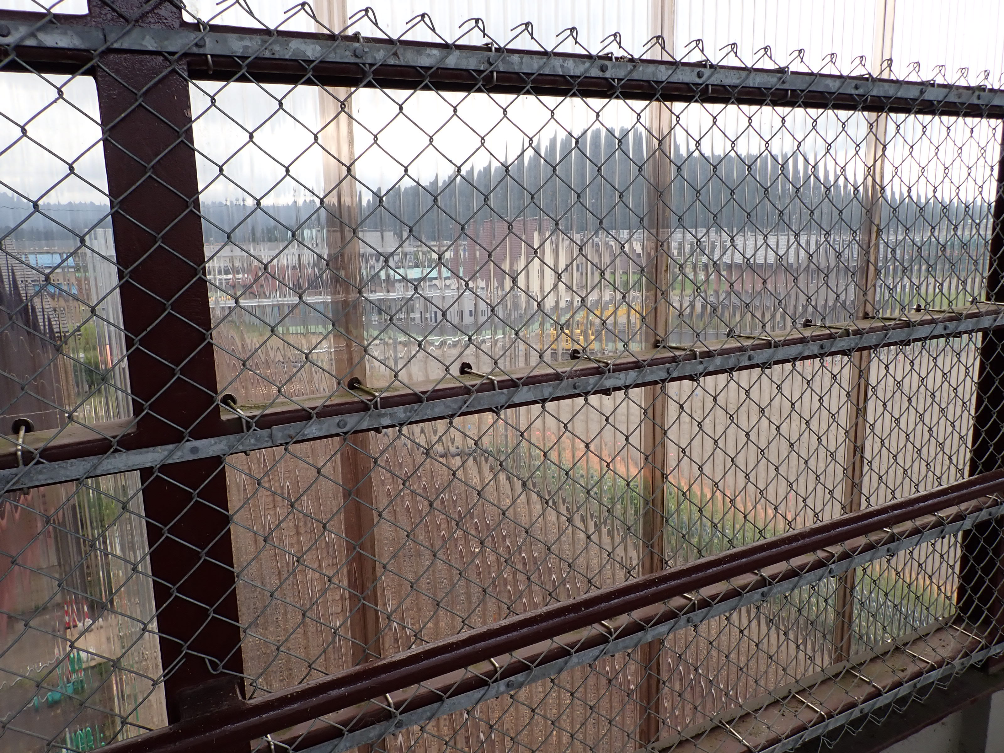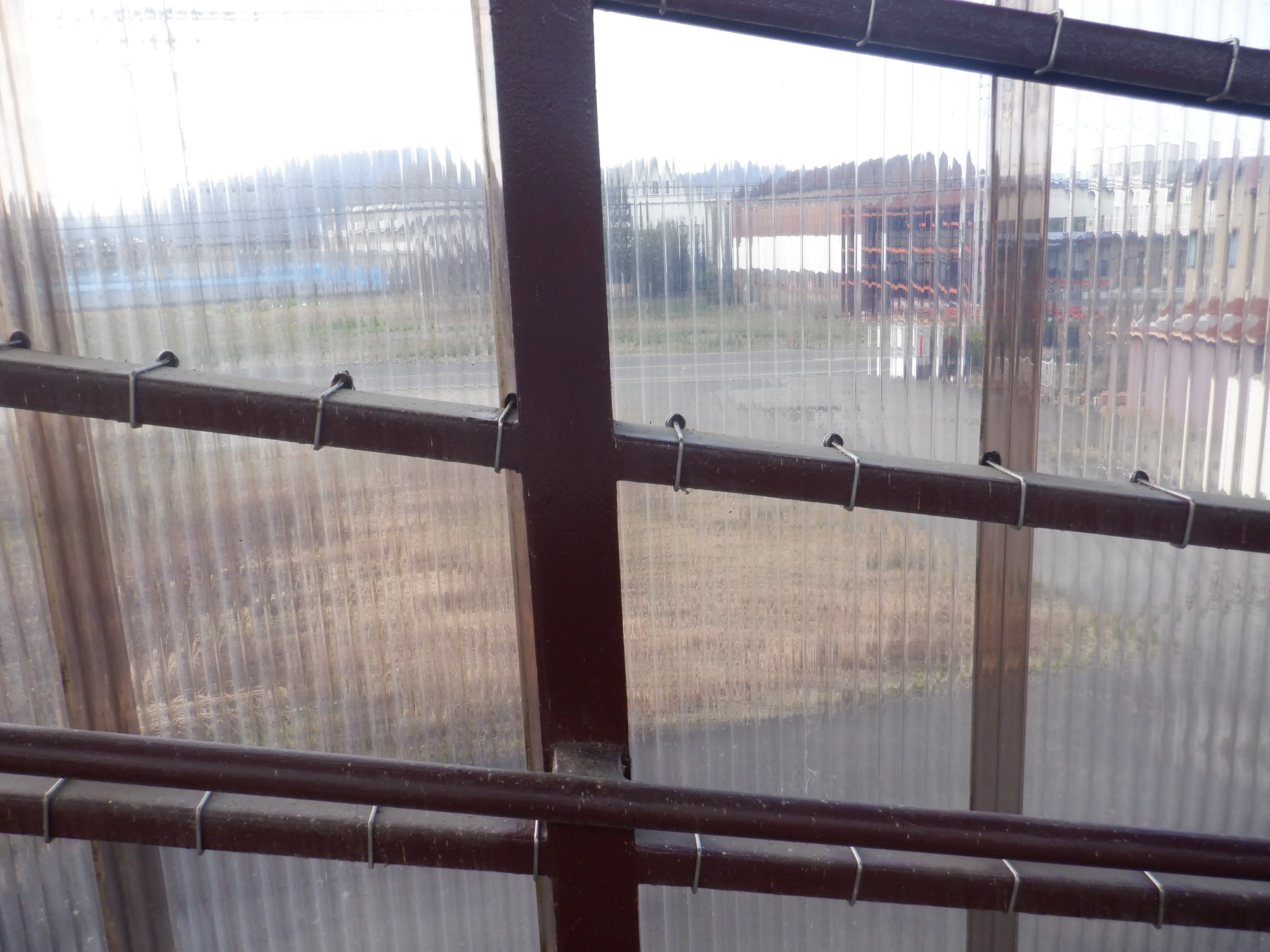 歩道橋内の様子とプラスチックトタン越しに見た駅が作られるところ。