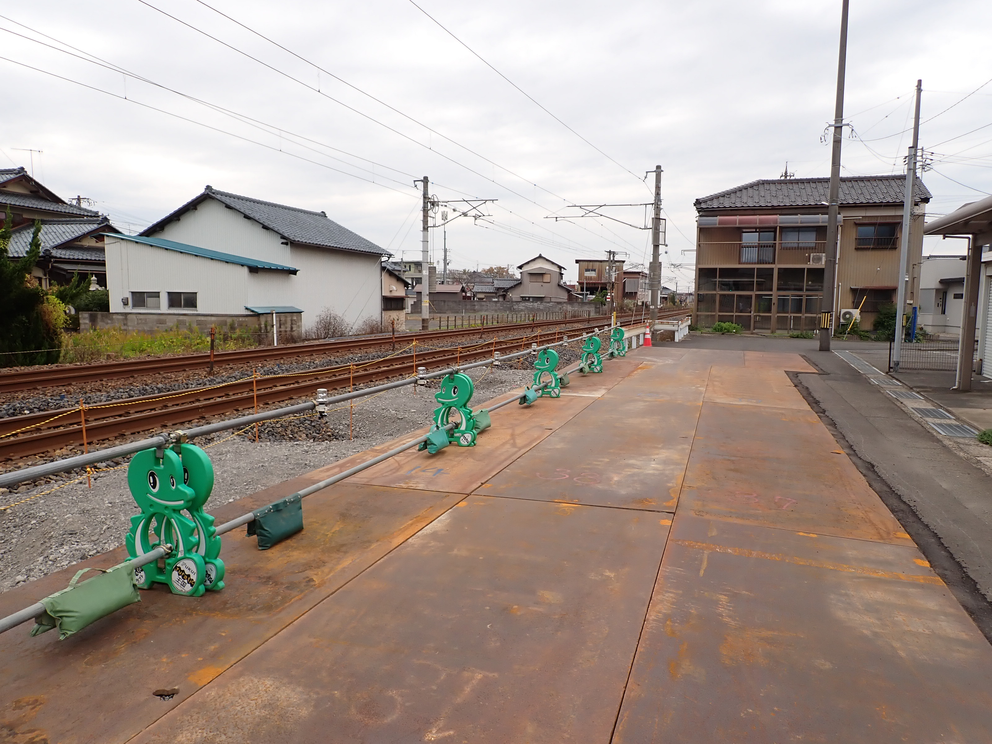 2番のりばとなるところの武生駅側。バリケードの前後に鉄板が敷かれていました。