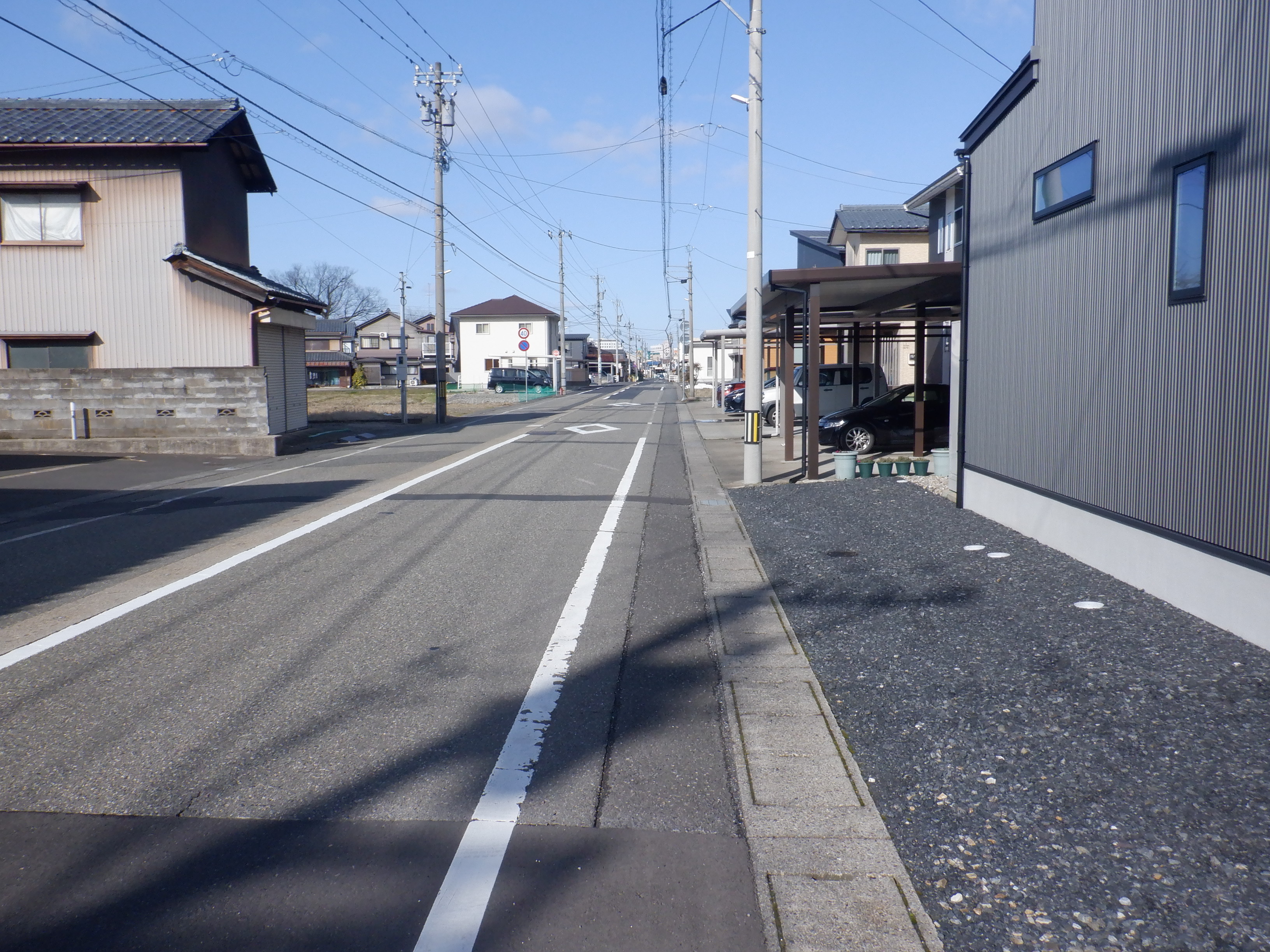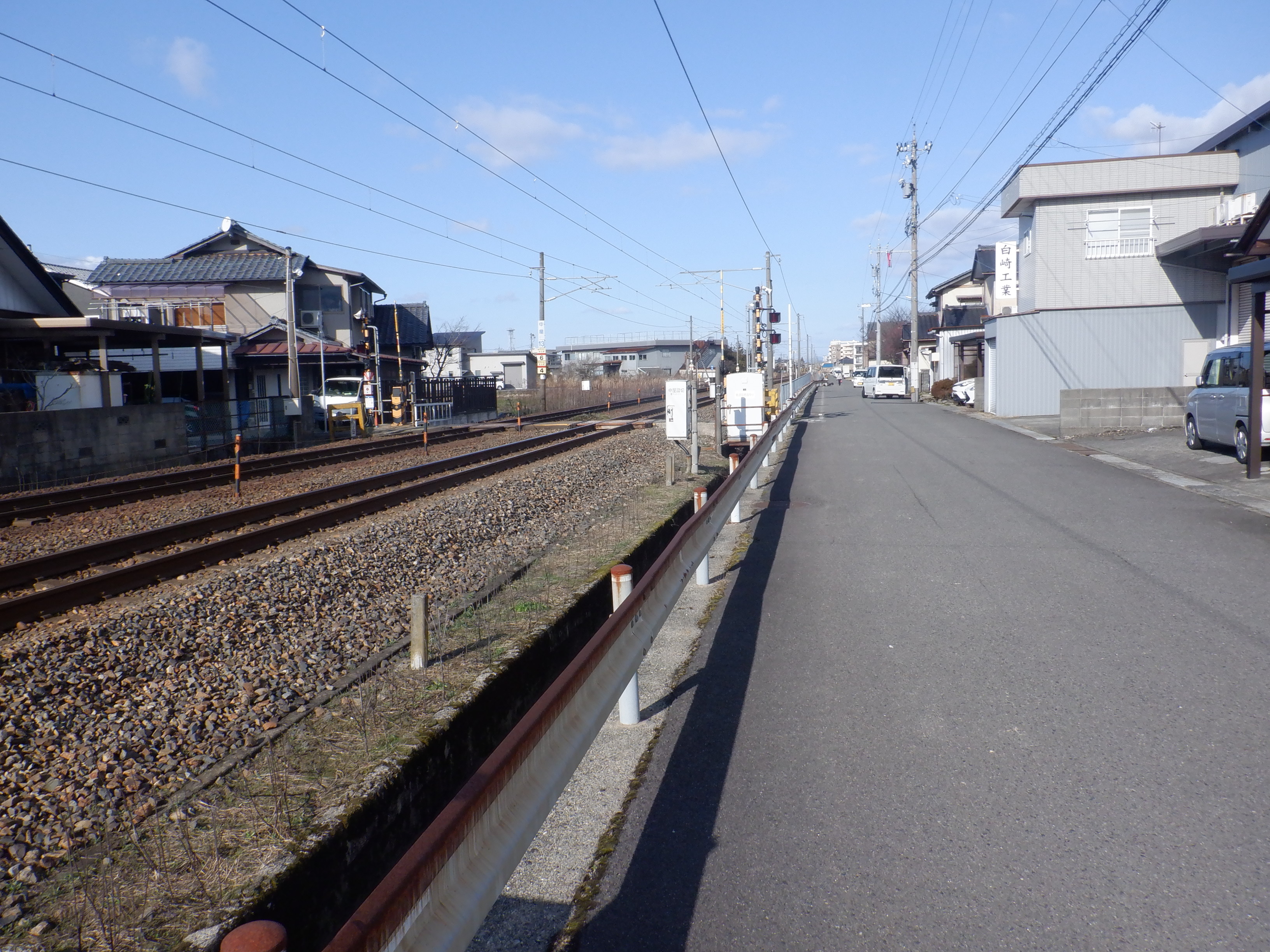 右に曲がり、踏切の手前で線路沿いに方向を変えます。住宅地の中を通ります。